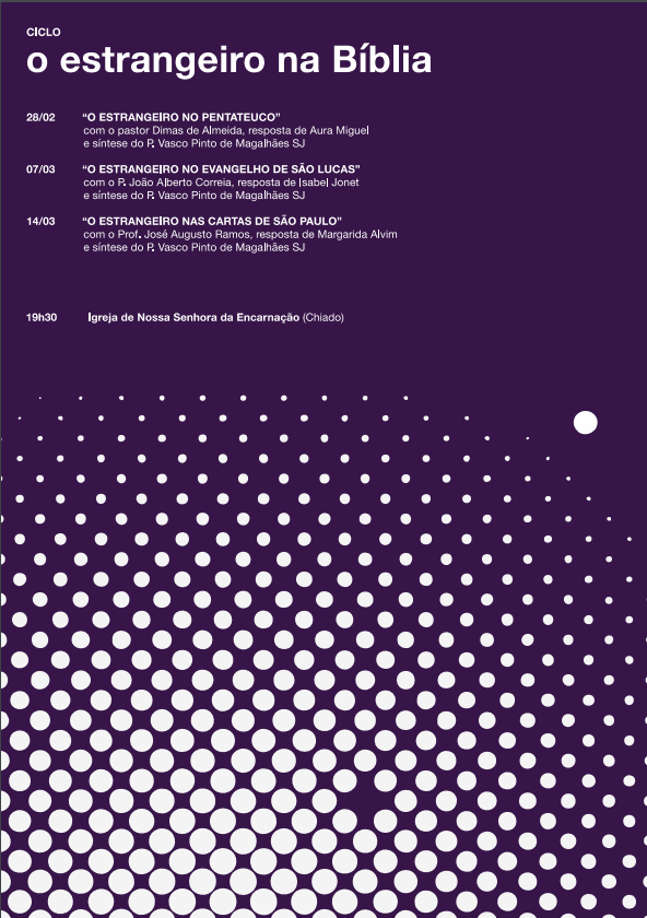 O primeiro evento é um ciclo de conversas na Paróquia da Encarnação, no Chiado. Com este evento, pretende-se fomentar conversas entre a Bíblia e a doutrina social católica no século XXI à volta das prescrições religiosas sobre o acolhimento reservado ao estrangeiro. Assim, desenham-se três diálogos entre três biblista e três católicos socialmente activos, partindo em cada sessão de um texto bíblico diferente. A unidade do ciclo será assegurada por um teólogo, o P. Vasco Pinto de Magalhães SJ, que proporá uma síntese no final de cada uma das três sessões.