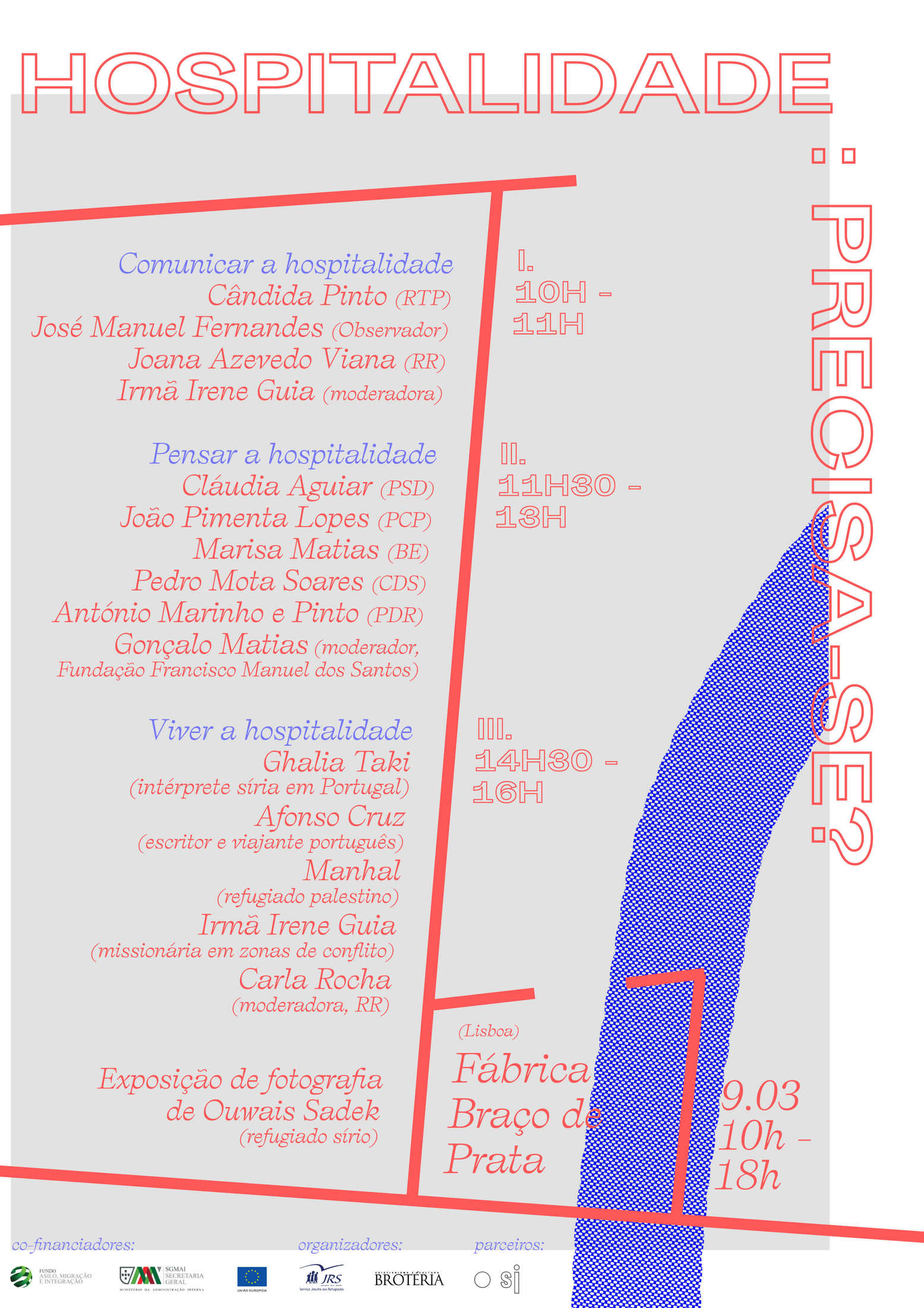 O segundo evento – e o evento principal – tem o título “Hospitalidade: precisa-se?” e terá lugar a 9 de Março. O dia terá duas partes complementares, com uma manhã mais institucional e uma tarde num registo mais pessoal. Uma vez que nessa altura estaremos em pleno build-up para as eleições europeias, de manhã olharemos para a hospitalidade sob um prisma político e social, com a ajuda de convidados politicamente ativos ou socialmente empenhados. De tarde, ouviremos pessoas concretas, migrantes (emigrantes e imigrantes) que falarão das suas experiências de hospitalidade e de falta dela. Durante este evento, estará aberta ao público uma exposição de fotografias de Ouwais Sadek, sírio de 27 anos chegado em fevereiro a Portugal. O dia terminará com um concerto.