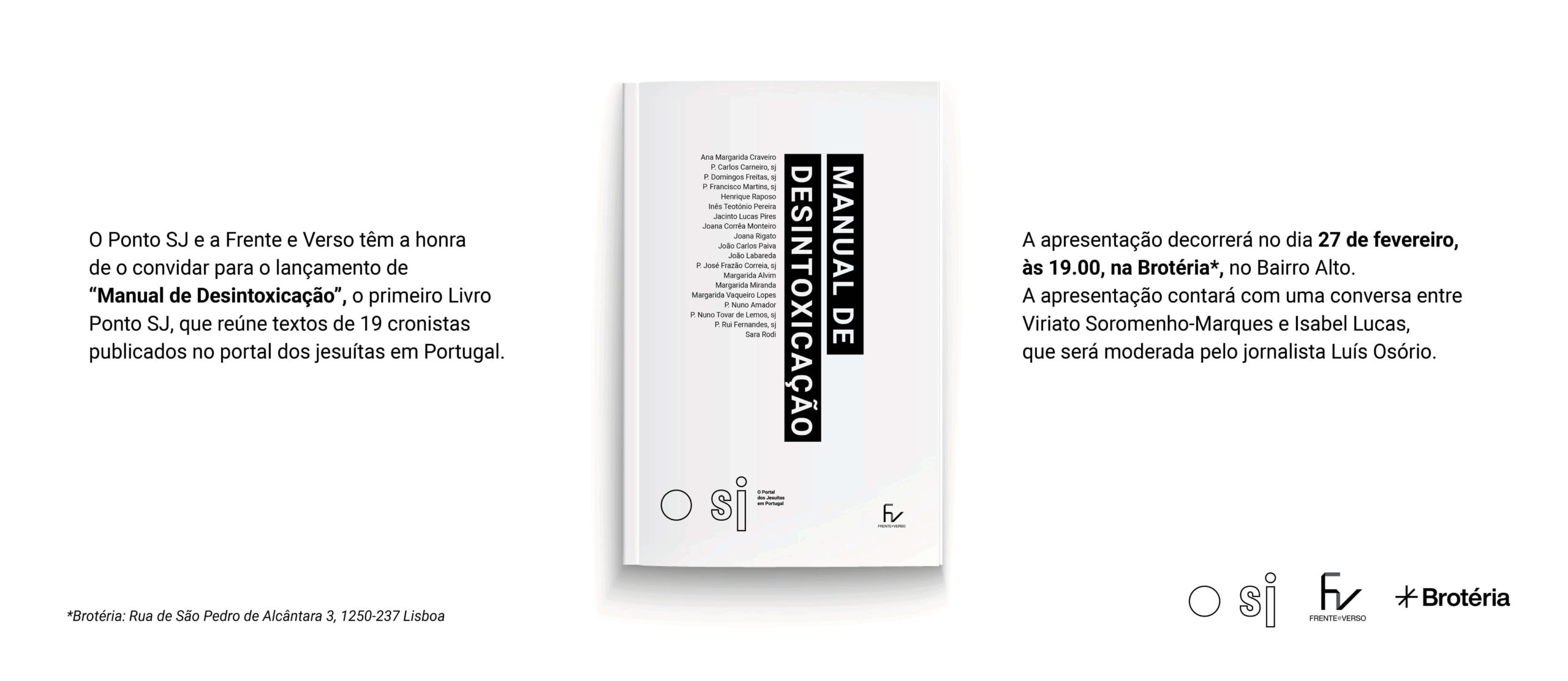 Será apresentado no dia 27, às 19.00, na Brotéria, no Bairro Alto, pelo jornalista e escritor Luís Osório. A apresentação de “Manual de Desintoxicação” será ainda motivo para uma conversa entre Viriato Soromenho-Marques e Isabel Lucas, moderada por Luís Osório.