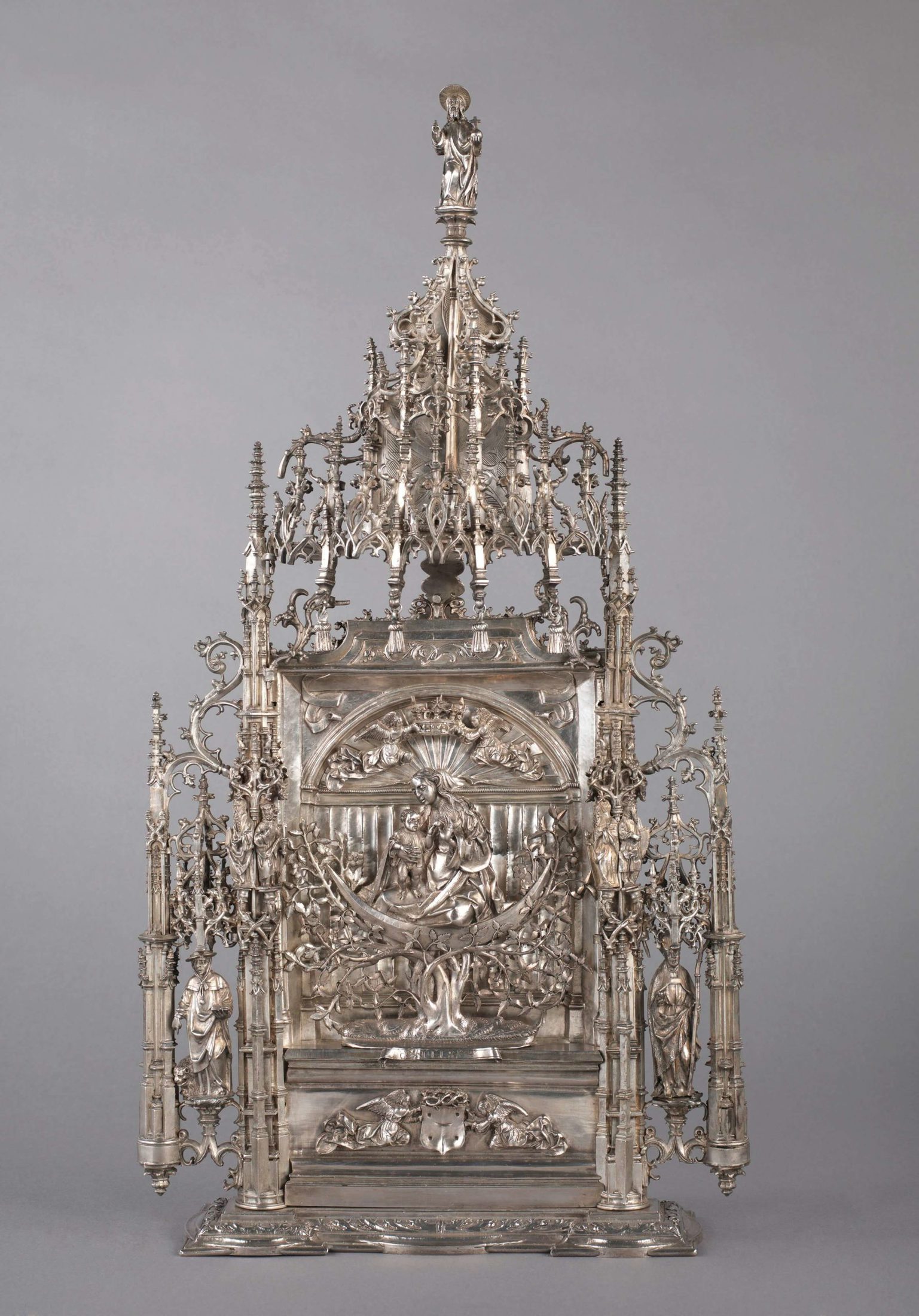 Tal se deve, em primeiro lugar, à qualidade do desenho e da composição observáveis nesta alfaia e à excelência técnica da sua execução; em segundo, ao facto da sua dimensão ser verdadeiramente fora do comum (56 cm de altura), comparativamente a outros espécimes da mesma tipologia existentes em Portugal (cerca de 20 a 30 cm); por último, por ser a verdadeira cabeça de série de uma categoria de alfaia paralitúrgica – o porta-paz – da qual, ainda que não absolutamente rara, não muitos exemplares chegaram aos dias de hoje no panorama português. E qual era, de facto, a função deste objeto relativamente pouco conhecido e já tão distante da liturgia dos dias de hoje? O liturgista beneditino D. António Coelho, no seu Curso de Liturgia Romana, esclarece o seguinte: “Desde que se suprimiu para os fiéis o ósculo da paz por meio de abraço, passou-se a transmitir-lhes a paz por meio da patena, e mais tarde por meio de um pequeno instrumento, ordinariamente de metal, em que está gravado um símbolo piedoso, e que tem por trás uma asa. Êste instrumento é requerido para dar a paz a um Cardial ou ao Bispo diocesano, quando assistem a uma Missa rezada; ao clero que assiste no côro a uma Missa cantada sem diácono nem subdiácono; a um príncipe que assiste solenemente a uma Missa qualquer; aos magistrados e outras personagens que assistem em corporação a uma Missa solene. Tanto o Celebrante que dá a paz como as pessoas que a recebem devem beijar o porta-paz. O primeiro do clero que recebeu a paz deste modo pode-a passar, por abraço, ao segundo do seu lado, e êste ao terceiro e assim por diante.” (Curso de liturgia romana, tomo II, Mosteiro de Singeverga, 1943, p. 246)