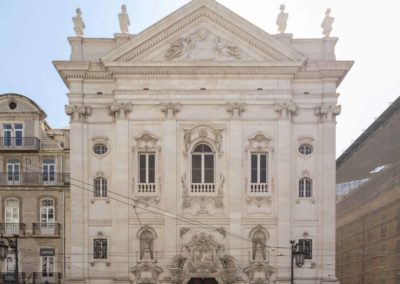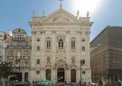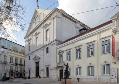 A igreja, construída como paroquial da Encarnação no princípio do século XVIII, foi reconstruída depois da derrocada e do incêndio provocados pelo terramoto de 1755, em estilos barroco e rococó. Na fachada, destaque para duas esculturas seiscentistas que se encontravam na Porta de Santa Catarina, da muralha de D. Fernando.