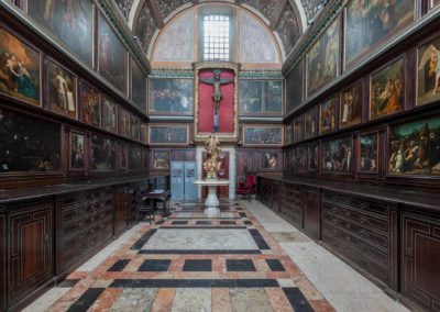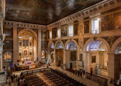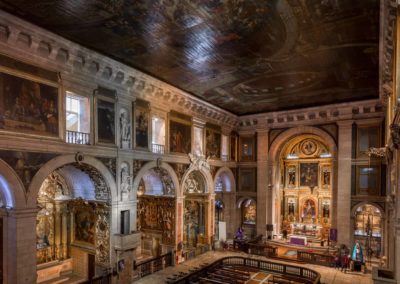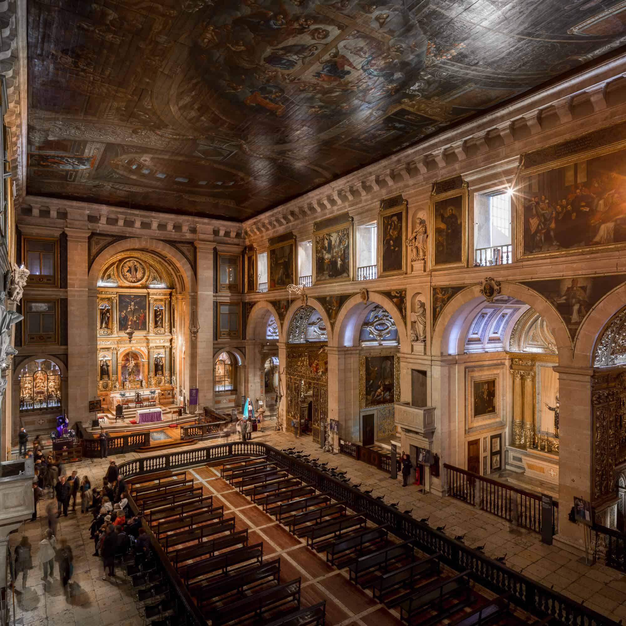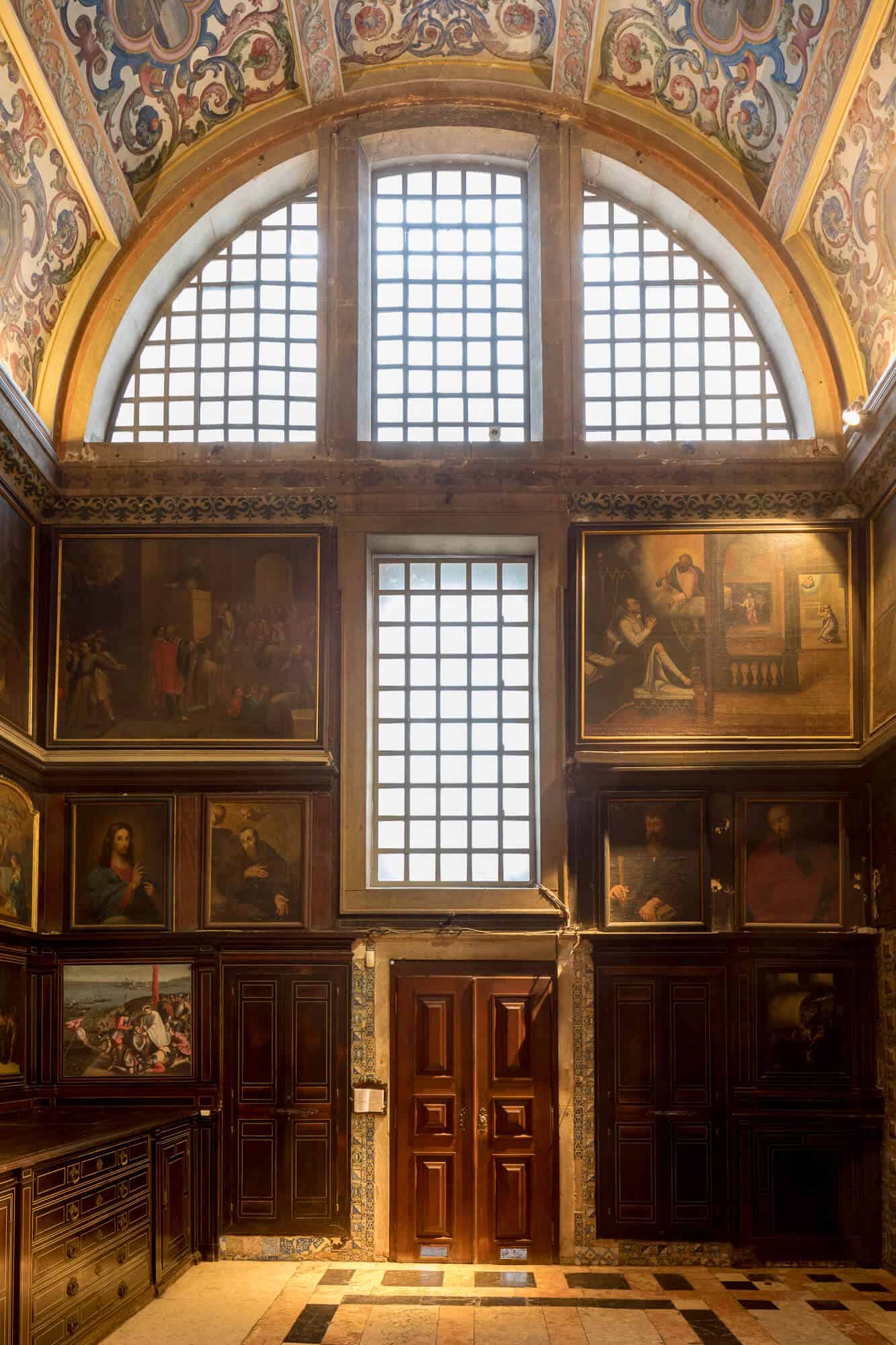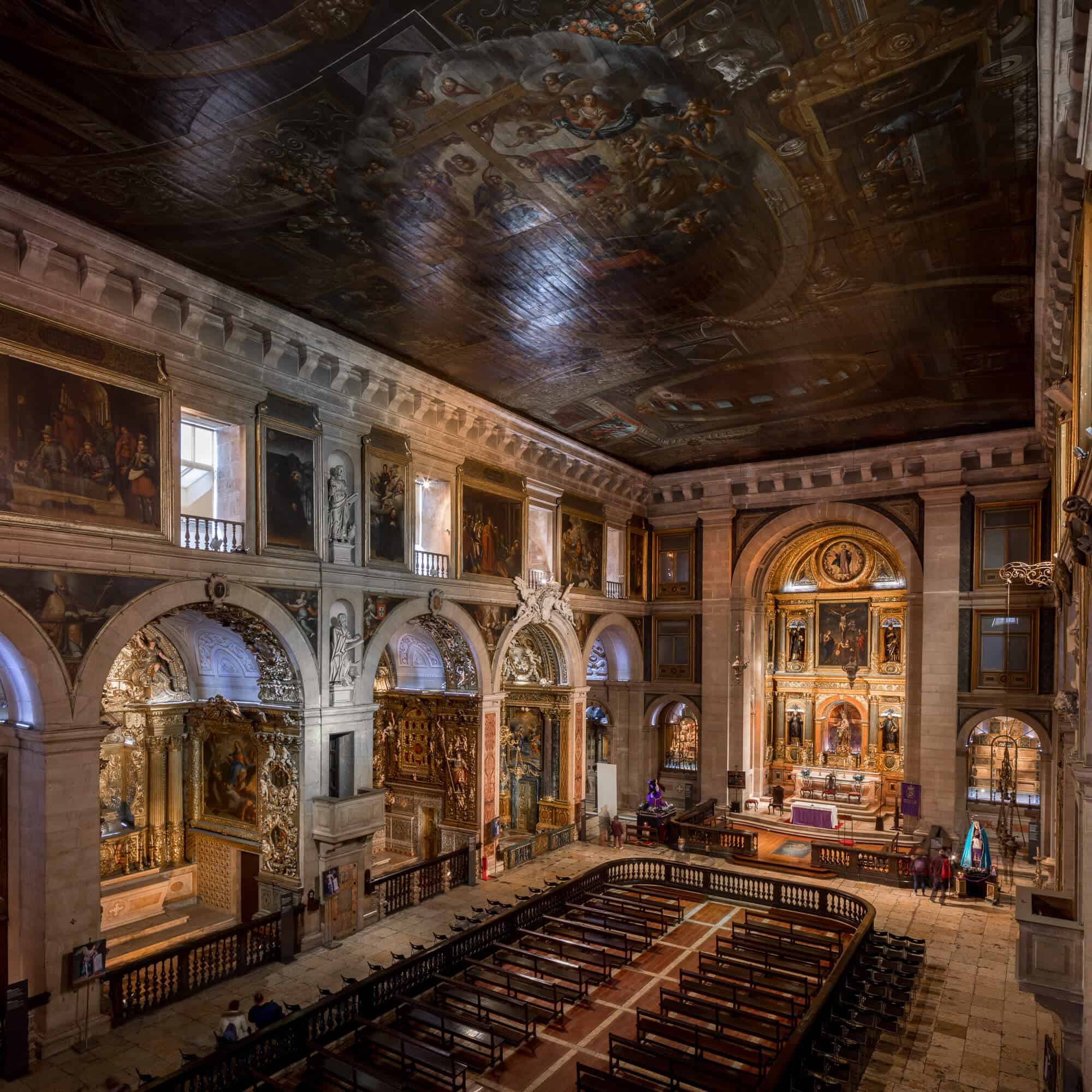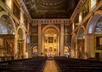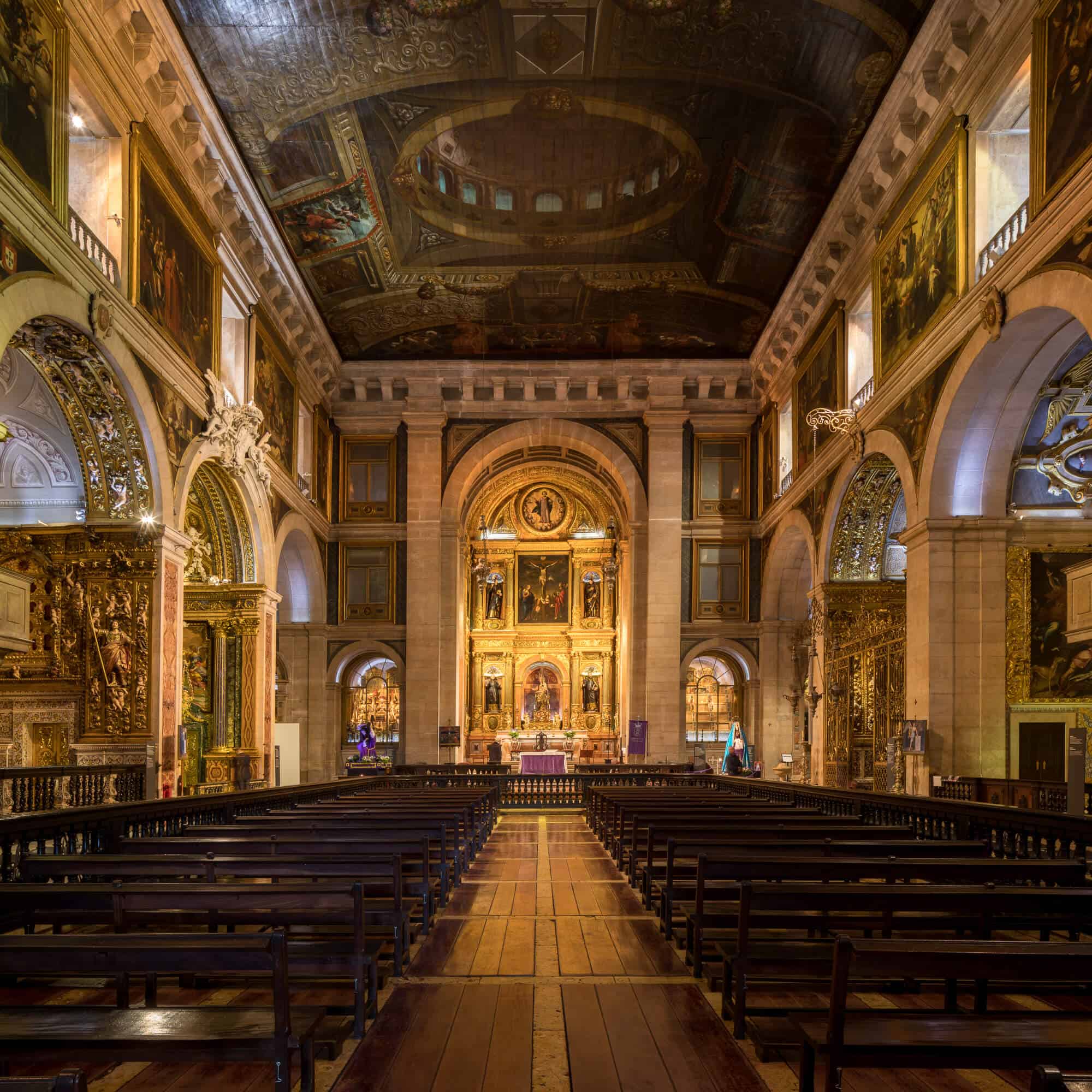 O riquíssimo interior maneirista e barroco, de estilo “jesuítico”, combina mármores, talha dourada, pintura, escultura e azulejo. Destaca-se a capela de São João Baptista, de pedras nobres, metais e mosaicos, encomendada em Roma por D. João V.Encontra-se na parede do cruzeiro o túmulo do Padre Simão Rodrigues, um dos fundadores da Companhia de Jesus e o primeiro provincial de Portugal.